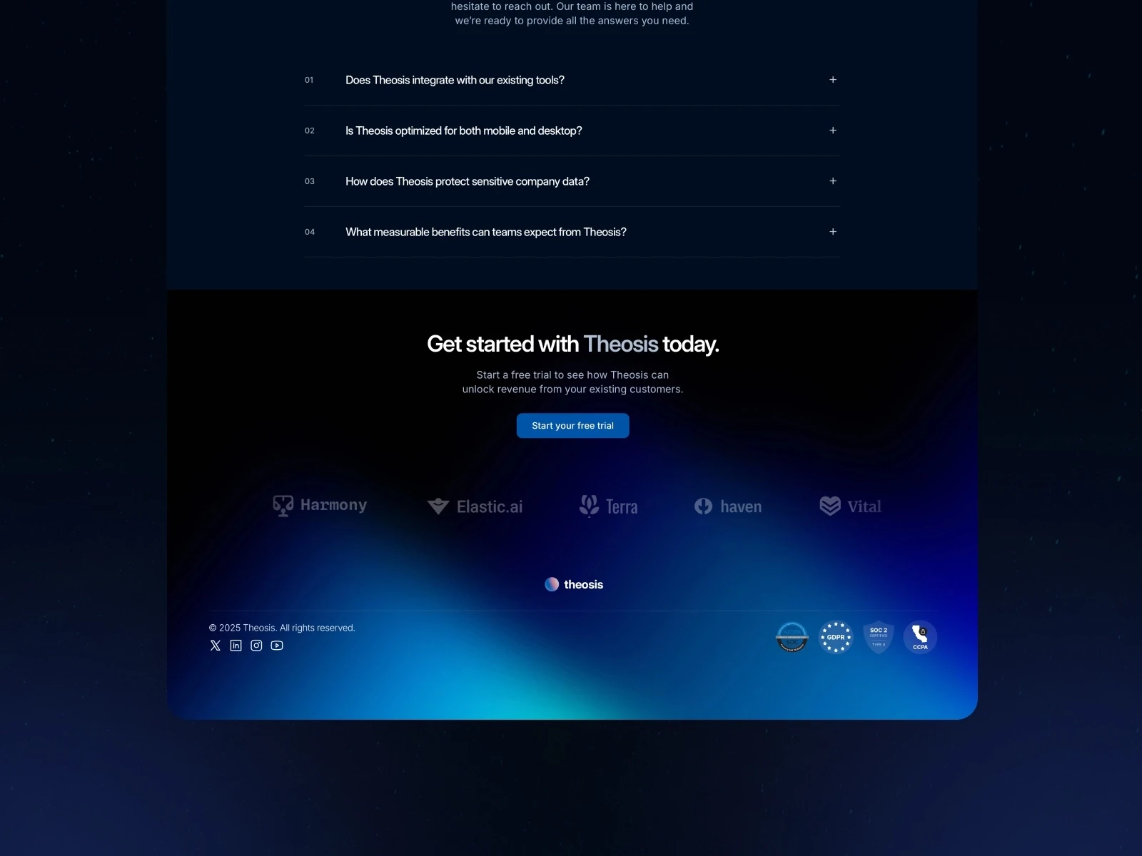 Theosis is designed specifically for teams working at the frontier of technology. Whether you're launching an AI tool, a machine learning platform, or a next-gen SaaS product, Theosis gives you the visual language to match your ambition. The dark aesthetic and sleek UI communicate innovation without saying a word.
